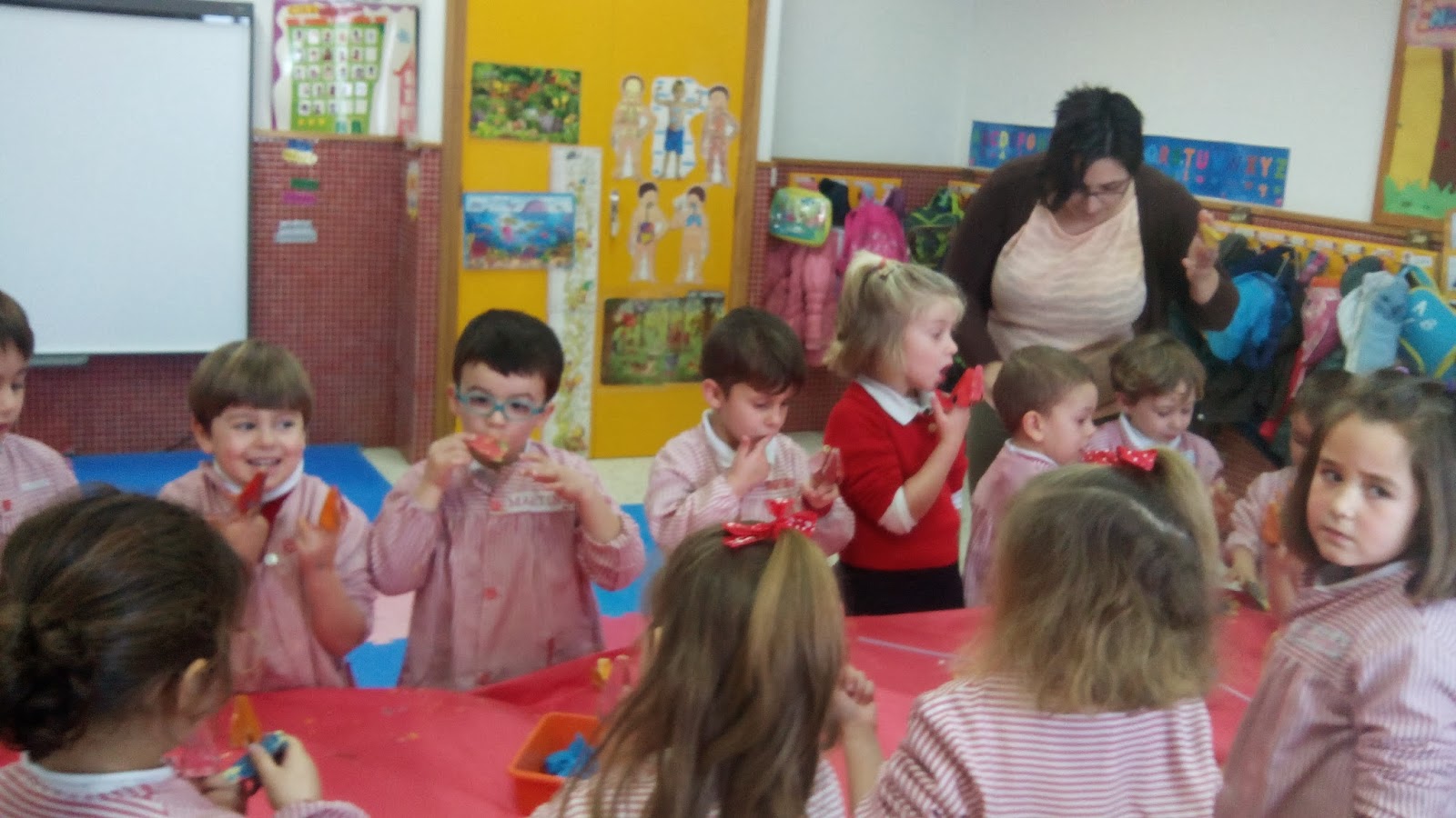 El pasado miércoles 26 de Febrero tuvimos la suerte de que vinieran al cole cuatro mamás estupendas a realizar con las aulas de 4 años dos talleres magníficos: uno de brochetas con frutas y otro de flores con hueveras.