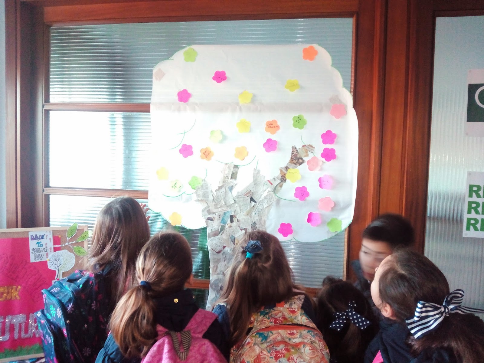 In this tree, people who walked to school could stick coloured papers with messages or just their names. These are the «walkers» sticking their papers as if they were the flowers of the tree.