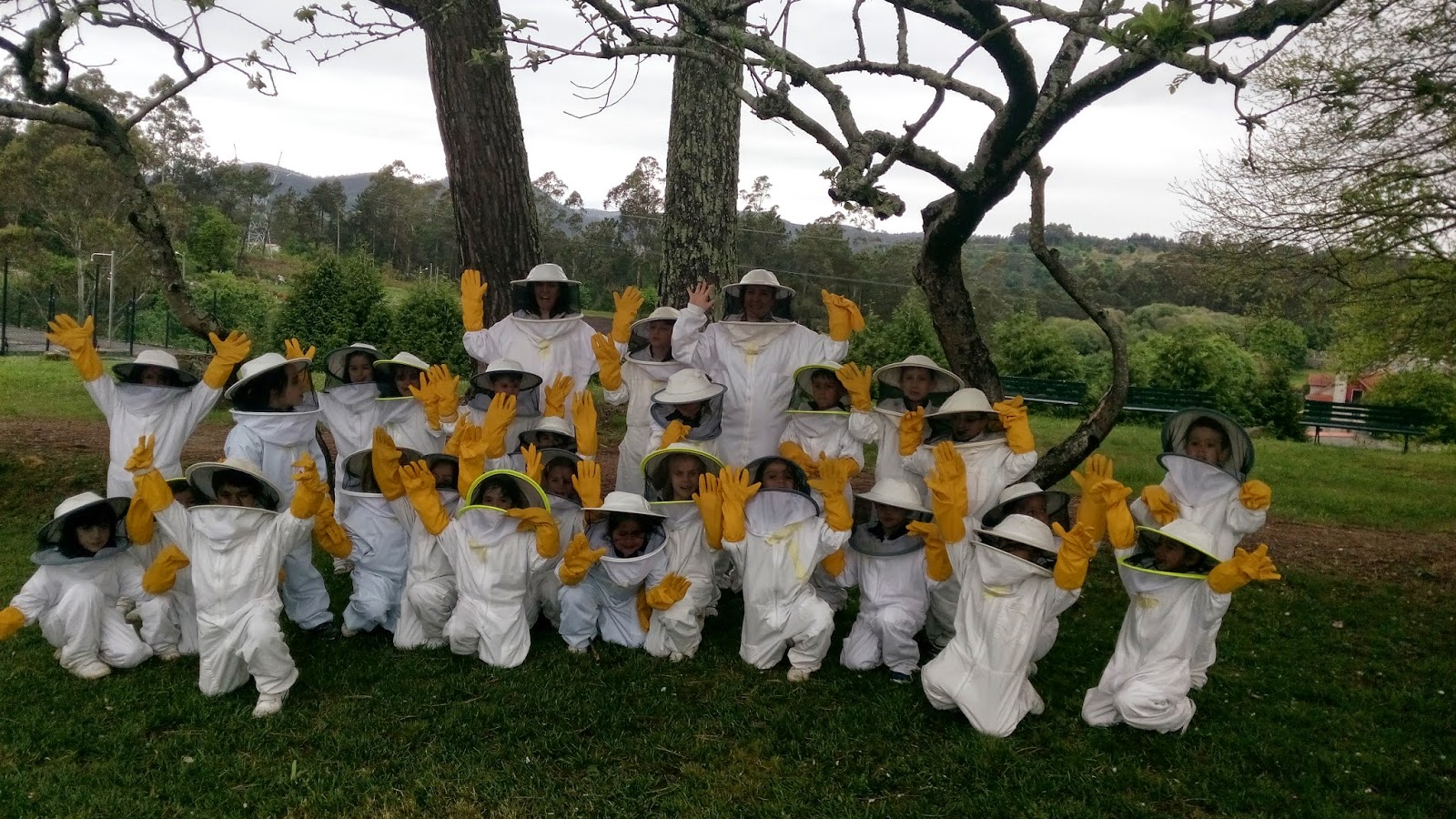 Unha das actividades que máis lles gustou foi poder vestirse de apicultores e entrar de cerca a ver ás abellas.