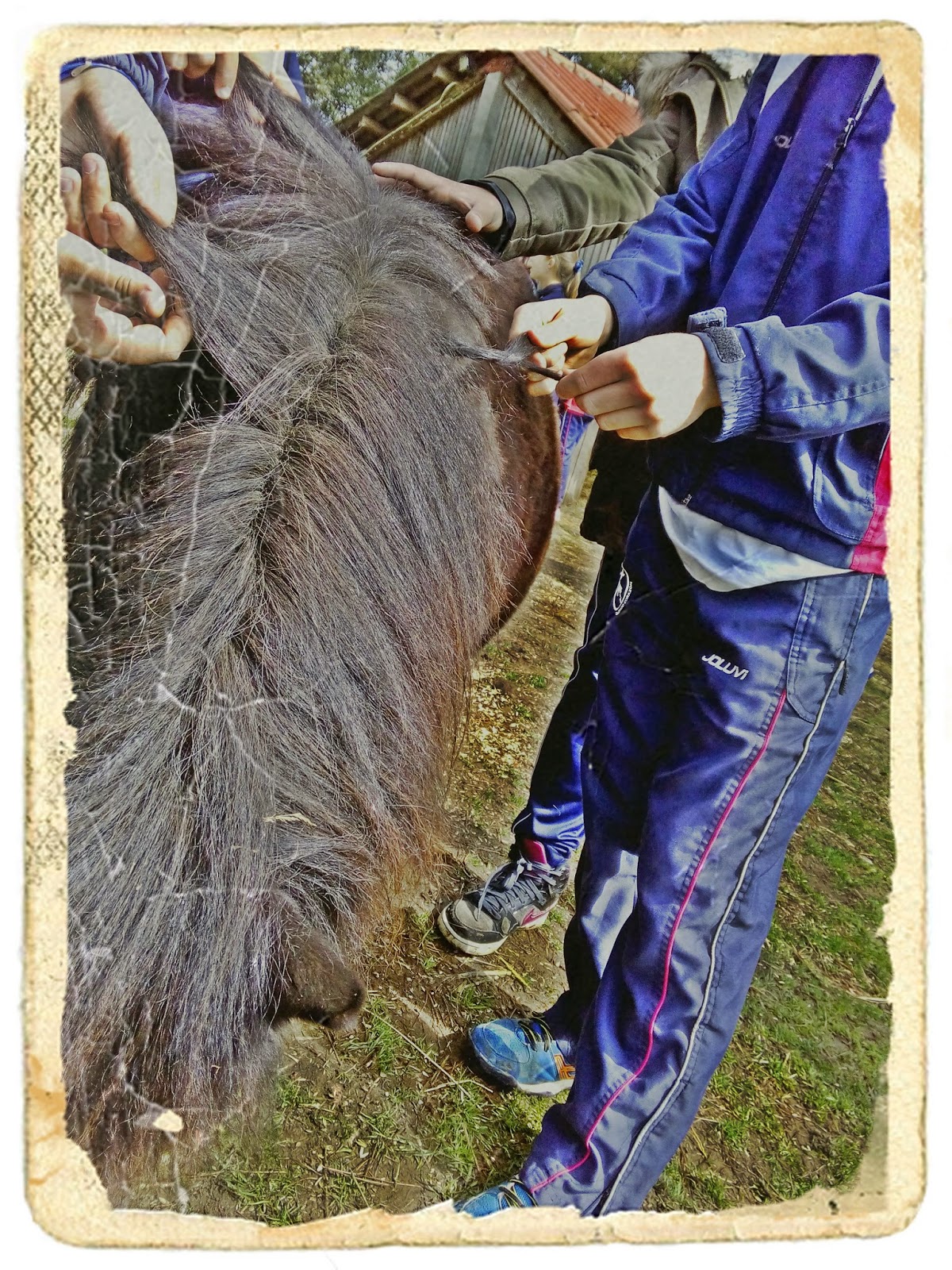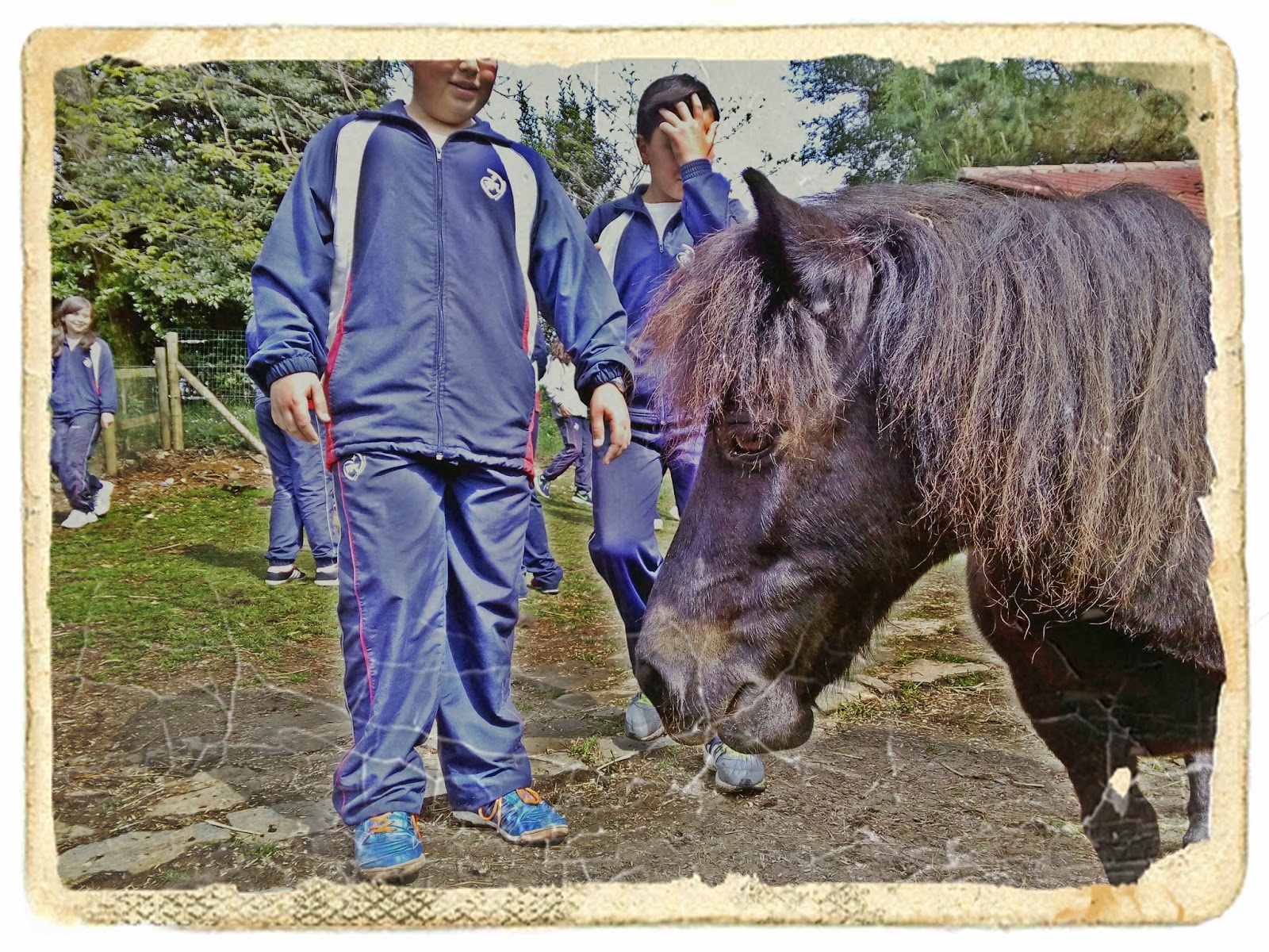Dividimos en dous grupos con cadansúa monitora, abandonamos a sala para comezar a visita polos diferentes e abondosos lugares da granxa. Así no Eco Zoo os alumnos puideron ter contacto directo cos animais: cabras, ovellas, ponis, porcos e galiñas … Na Eco Horta vimos os prados e os lugares de plantación máis importantes da granxa onde se alberga un invernadoiro.