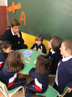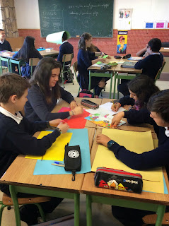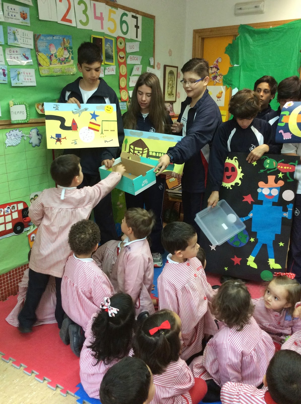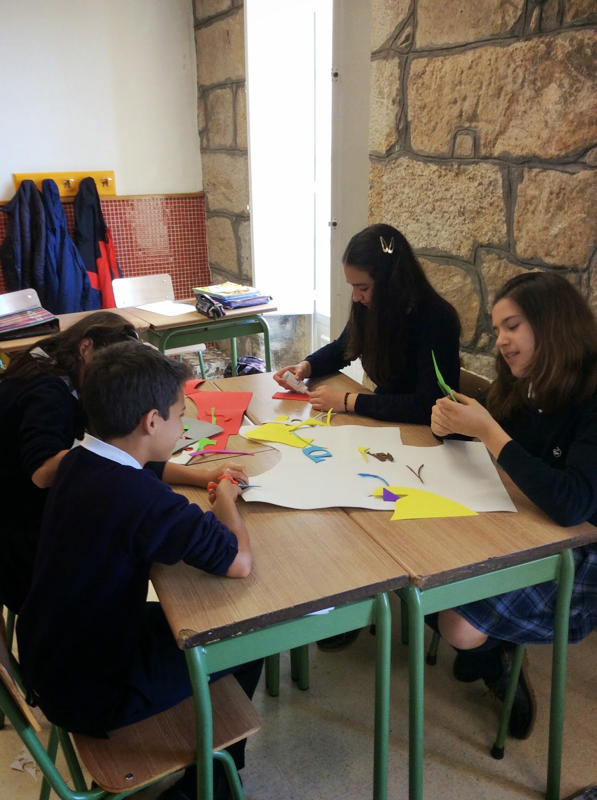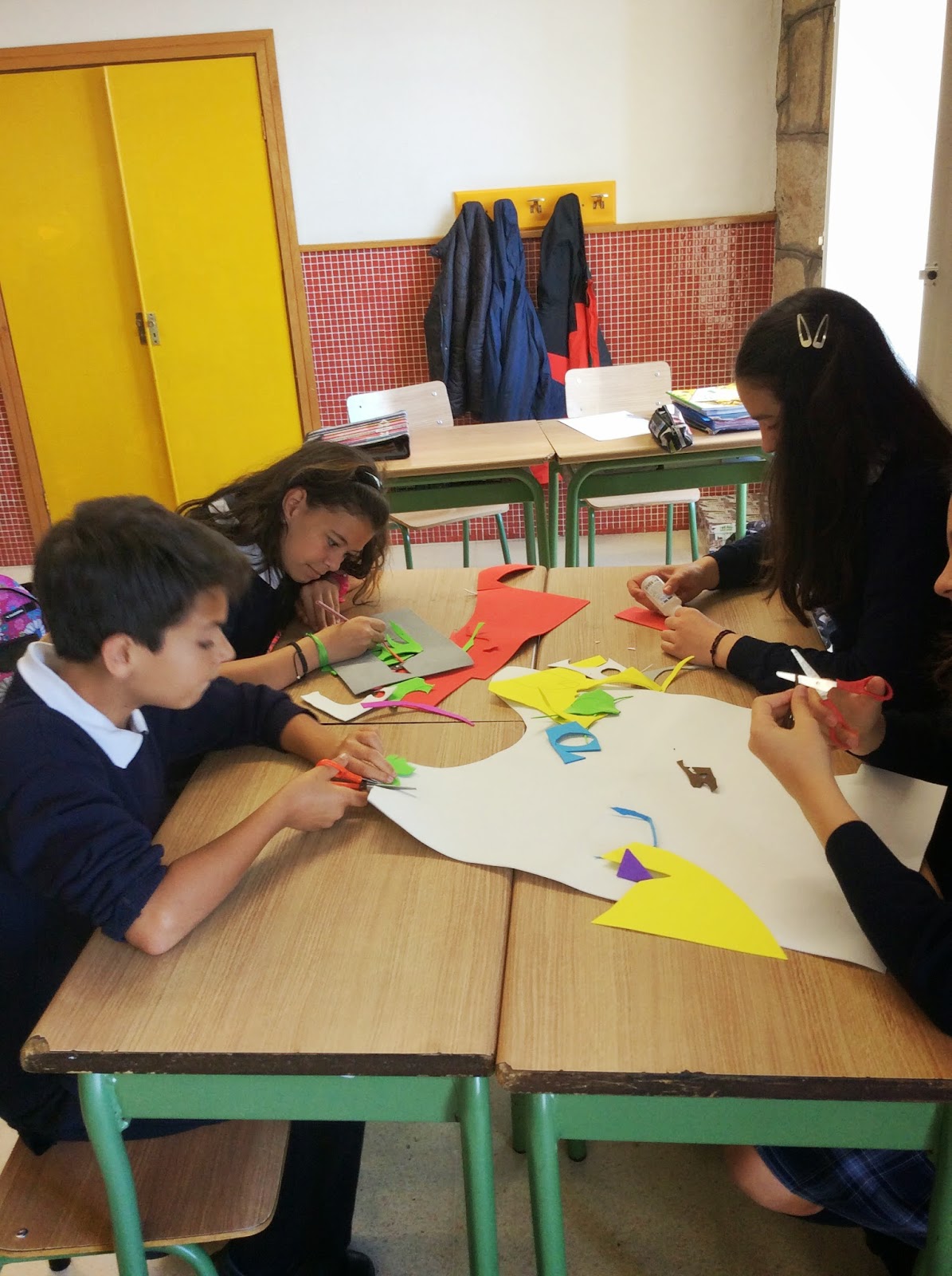 Este ano, os alumnos de 1º da ESO A fixemos un PROXECTO de plástica cos rapaces de tres anos. Tivemos que realizar un gran mural para decorarlles a parede do corredor que hai preto das súas aulas. Asociamos grupos cooperativos de meniños de infantil con grupos cooperativos de 1º ESO para elaborar entre todos o mural. Os pequenos tiveron que elexir, finalmente, de entre os proxectos de cada grupo o que quixeron que se colgara na parede.