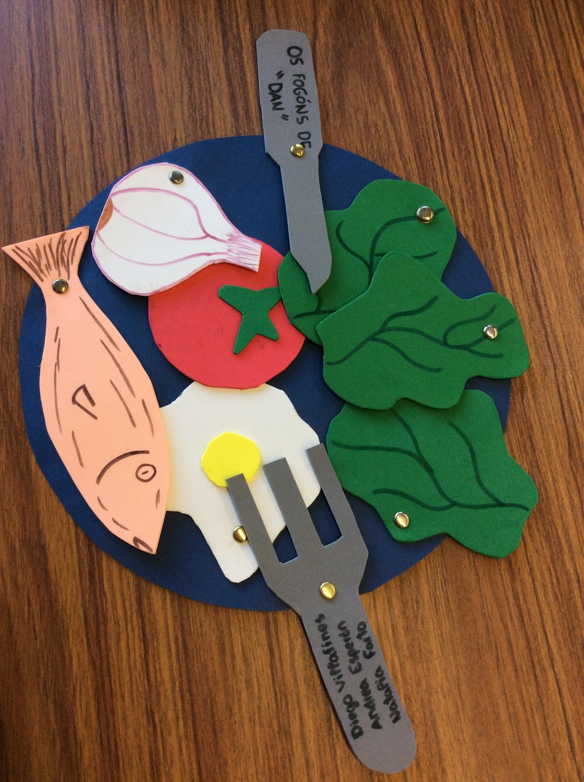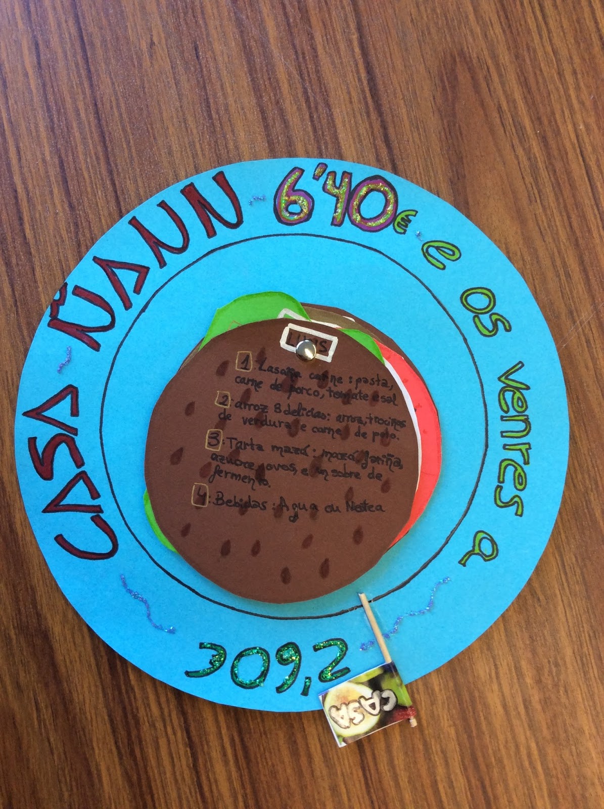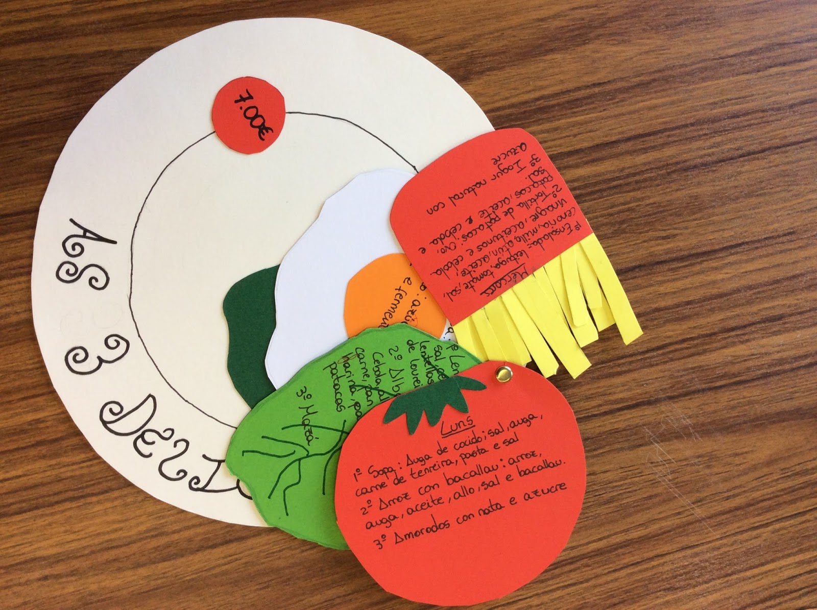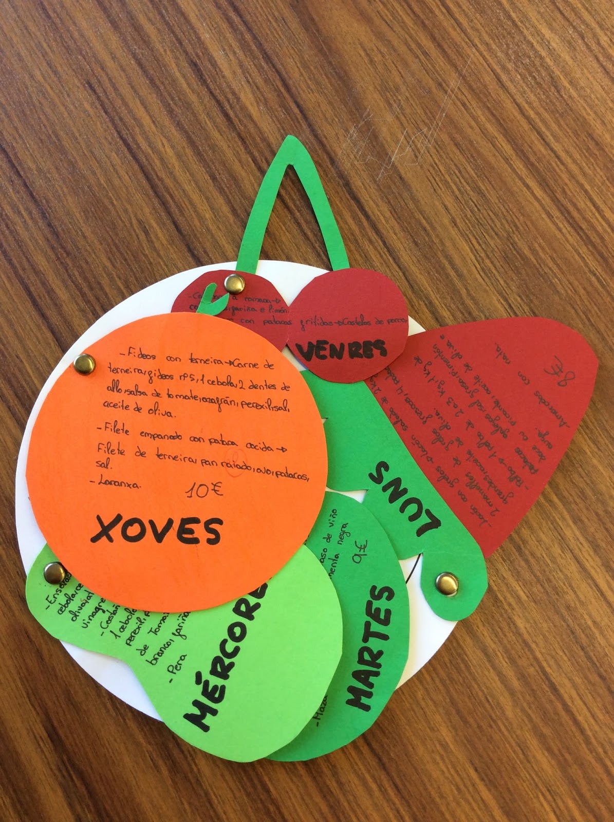 Para traballar co vocabulario dos alimentos os alumnos de 1º da ESO elaboraron, nas materias de Ed. Plástica e Lingua Galega, unhas CARTAS de MENÚ para cada día da semana moi orixinais. Empregaron para a súa realización os materiais que cada grupo cooperativo considerou necesario.