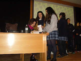 La charla continuó con un coloquio entre la escritora y nuestros alumnos de 1º y 4º ESO, muchos de los cuales le formularon preguntas muy interesantes sobre su obra. Finalmente, tuvieron la suerte de que les firmara sus libros.