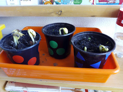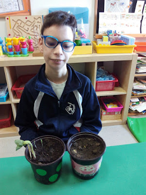 Las habas que plantamos dentro han crecido y presentan un buen tallo y más hojas grandes y verdes pero, para nuestra sorpresa, las habas que plantamos el mismo día y colocamos en el exterior del aula no han crecido nada de nada.