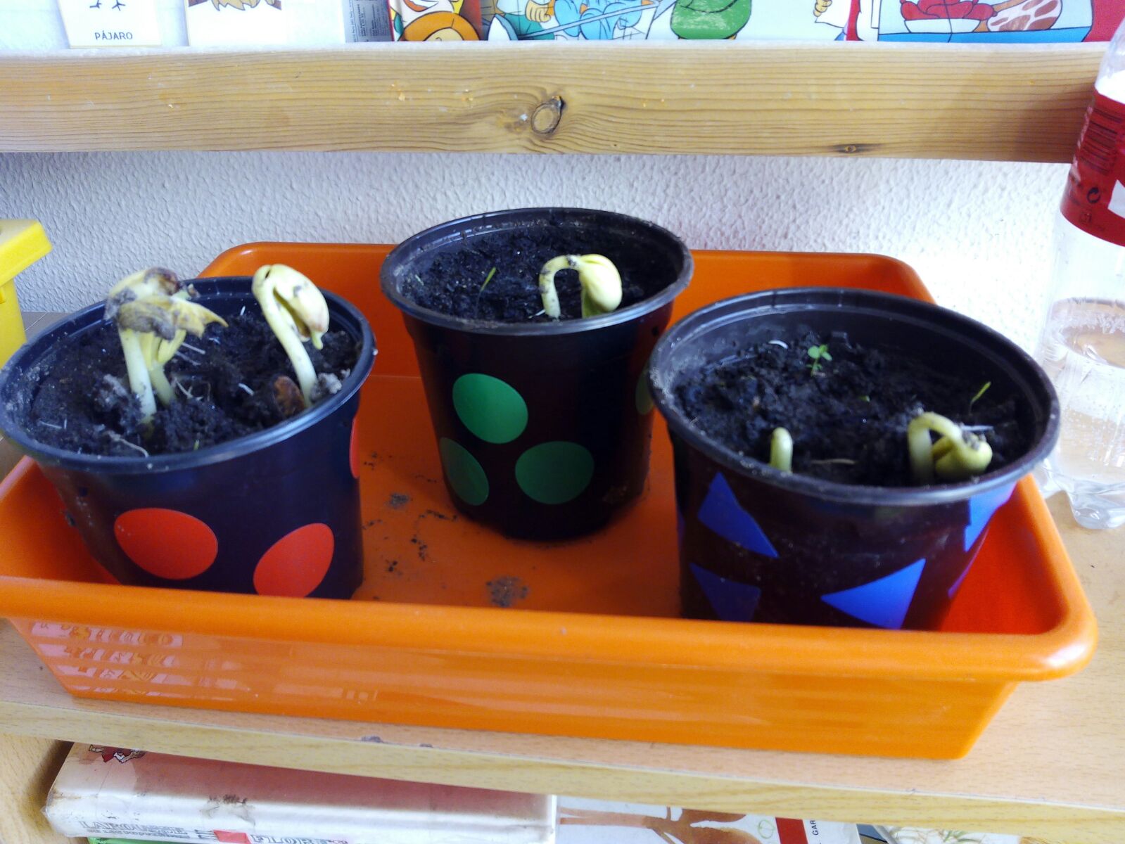 Pasados seis días podemos observar como  las macetas de interior ya han germinado y las plantas comienzan a crecer mientras que en las macetas de exterior no hay ningún signo visible de vida todavía.
