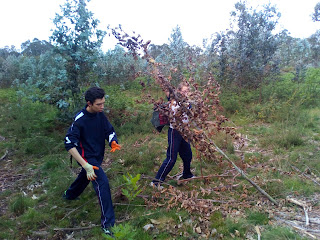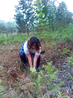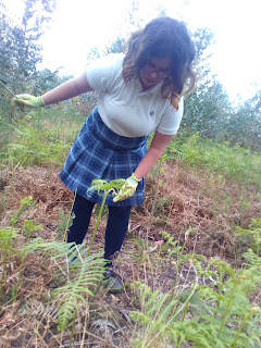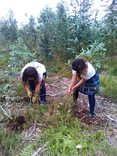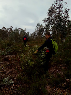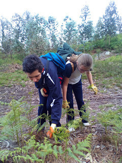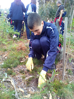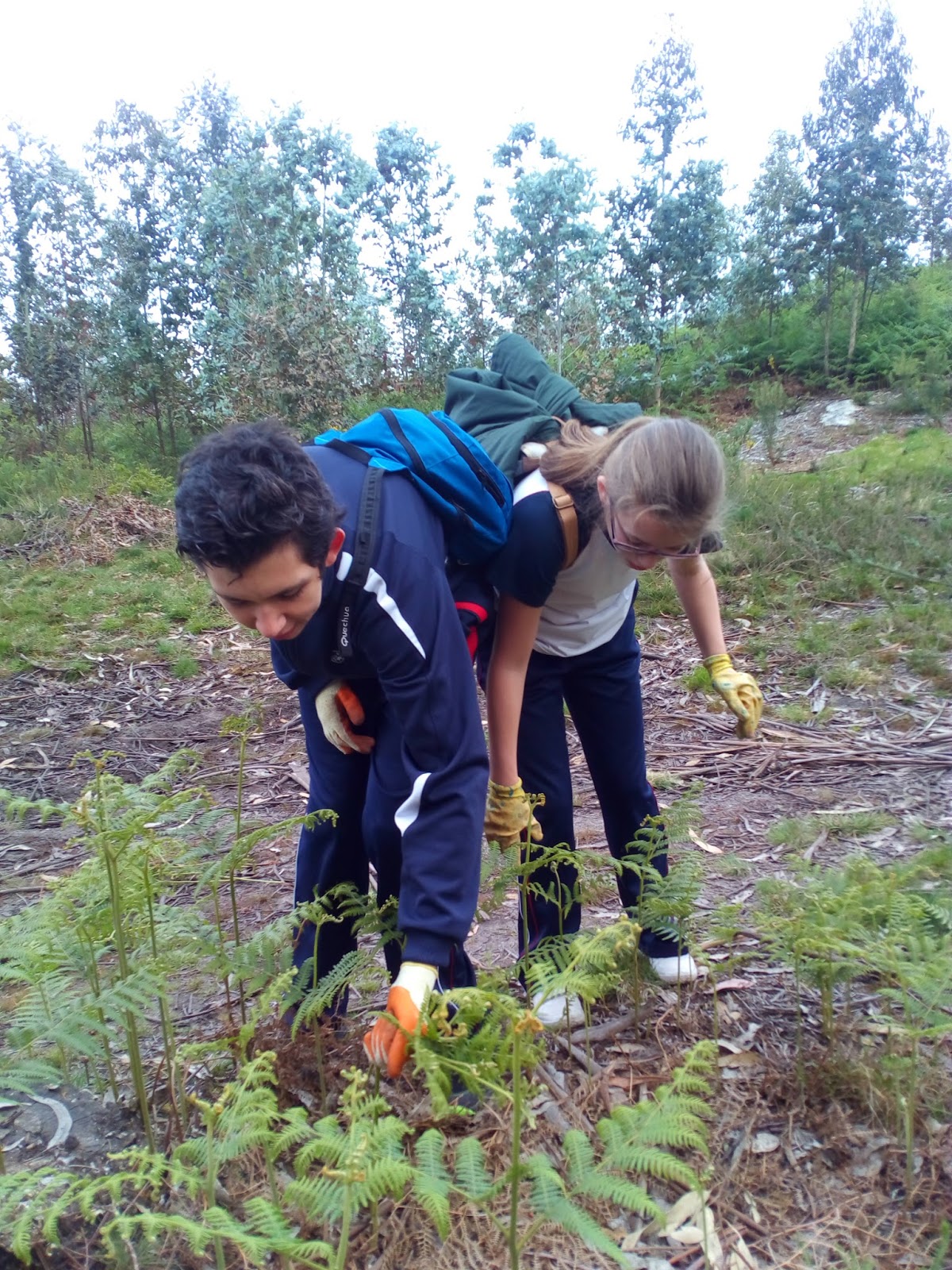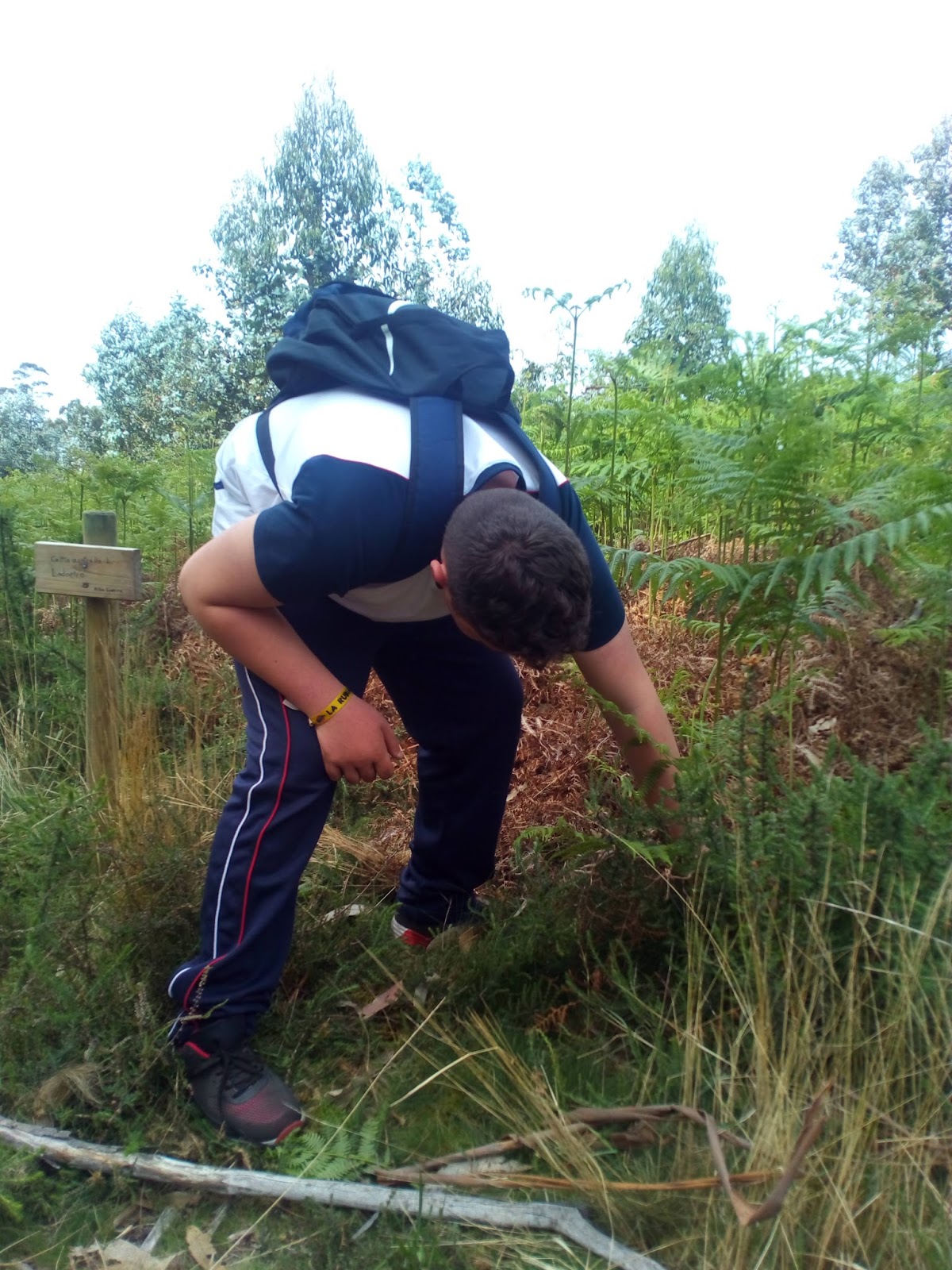 Allí  señalizamos con una cinta los árboles autóctonos que crecen en libertad  y realizamos tareas de limpieza alrededor de las especies plantadas en los dos cursos anteriores (amieiros, biduerios, hayas, robles, …) y para los que construimos en el taller de tecnología unos carteles con los nombres científico y común y el del alumno/a que se encargó de su plantación. Constatamos igualmente el óptimo estado de la gran mayoría, que crecen fuertes y a buen ritmo.