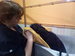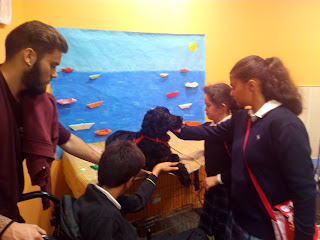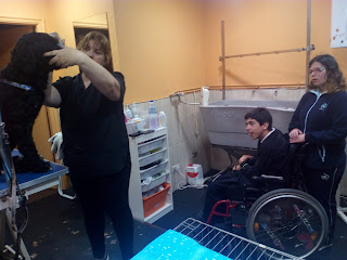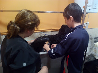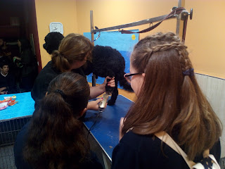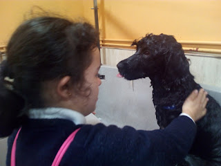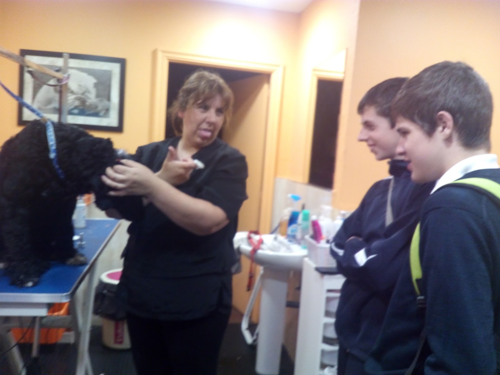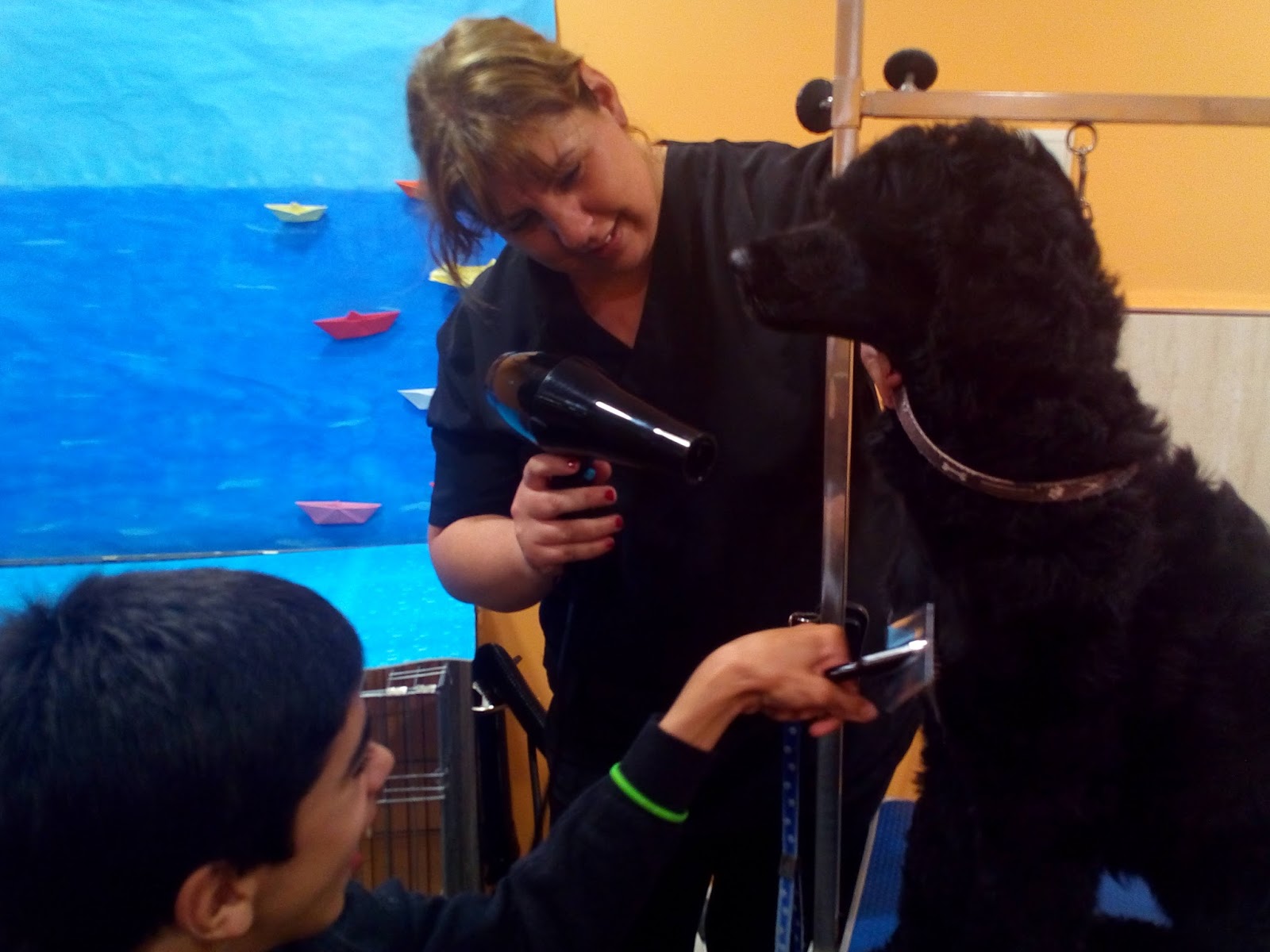 A principio de semana acompañamos a Abril, perra de Terapia Motriz, a la peluquería para cortar y lavar su pelo. Llegamos a Hipermascota, tienda y peluquería canina regentada por Teresa Quinteiro, y curiosamente, antigua alumna de nuestro colegio. Para empezar la sesión, Manu nos explicó los productos de la tienda y como se organizan en ella para cubrir las necesidades de las mascotas. También dimos un recorrido y compramos unos regalos para Abril.