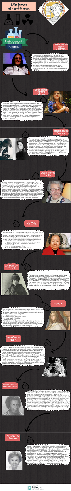 Dentro de las actividades a realizar con motivo del Día Internacional de la Mujer y Niña en Ciencia, a celebrar el 11 de febrero, se les ha pedido a los alumnos que cursan la asignatura de Ciencias Aplicadaas a la Actividad Profesional de 4º de ESO que seleccionasen 10 científicas o matemáticas, con las que elaborar una pequeña infografía resumen sobre su obra. Para ello han empleado la herramienta Piktochart, la misma con la que trabajaron para elaborar posters sobre el tratamiento de aguas en estaciones depuradoras y potabilizadoras.