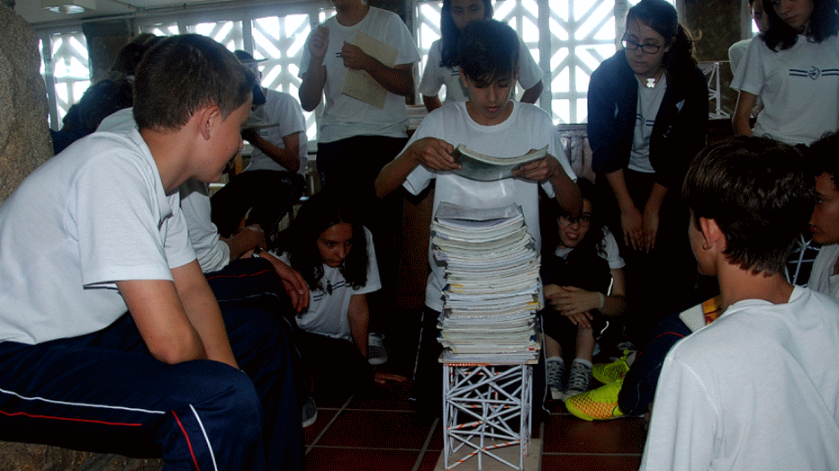 A diferencia de otros años, los alumnos de 2º ESO realizaron dos proyectos diferentes en el taller, en la asignatura de Tecnología. Los alumnos de 2º ESO A construyeron una catapulta, mientras que los alumnos de 2º ESO B intentaron levantar torres con perfiles de papel capaces de soportar un peso relativamente grande. En el aula hemos estudiado que la rigidez de una estructura depende de la naturaleza del material con que está construida, la cantidad de material, y la forma que adopta dicho material. Para poder comprobar el potencial del triángulo como elemento constructivo que aporta rigidez a una estructura, y al igual que hicieron unas semanas antes con spaghettis y plastilina, los alumnos de 2º de la ESO B construyeron torres con perfiles de papel. Recordar, que la última vez que se realizó este tipo de proyecto sólo pudimos colocar 86 libros y este curso se retó a los alumnos a construir torres que, superando los 50 libros fijados en el objetivo del proyecto, soportaran un peso mayor de los 100 libros…