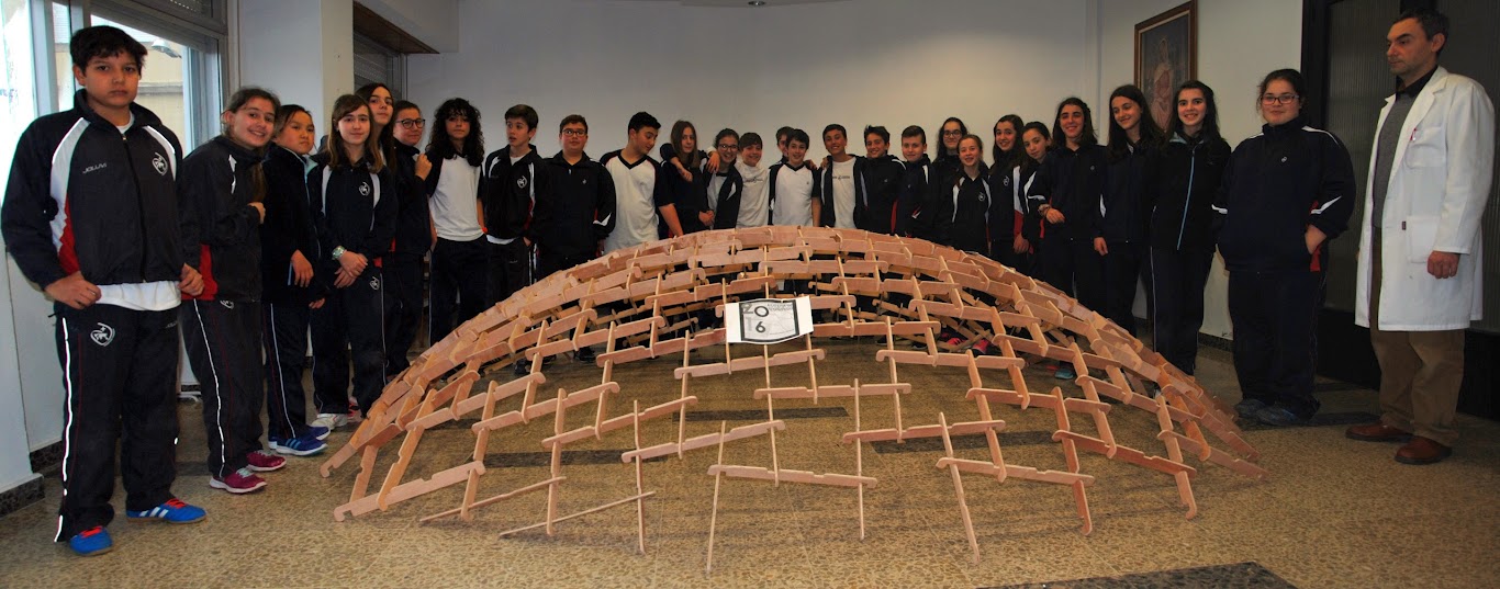 Durante estas semanas, y dentro de las actividades lanzadas por el Departamento de Matemáticas y englobadas en la Semana Matemática de Vigo y en el proyecto IMATXINA, los alumnos de ESO estáis montando diferentes cúpulas autoportantes, es decir, estructuras que se mantiene unidas y en pié gracias únicamente y exclusivamente a su propio peso y a la acción de la gravedad. Estas cúpulas son, por tanto, estructuras recíprocas, en las que los elementos que las componen están apoyados entre sí. El diseño original de estas cúpulas se deben al ingenio de Leonardo da Vinci (recogidos en su Codex Atlanticus, pag 899r y 899v). El mismo responsable, entre otros del puente autoportante construido por alumnos de 2ºESO hace unos años.