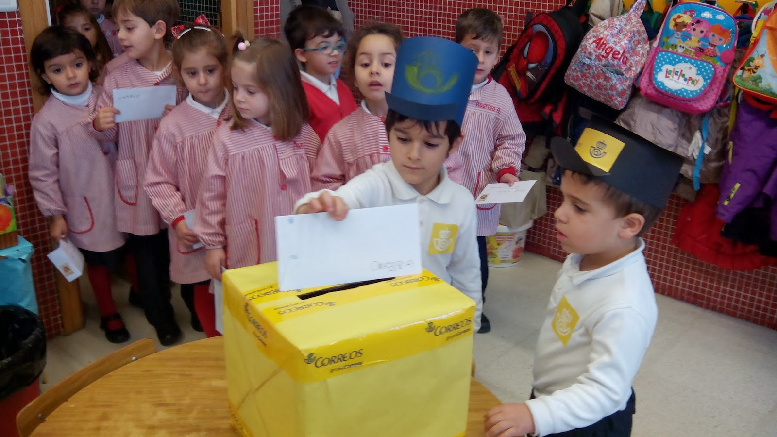 El último día del primer trimestre nos visitó en el cole nuestra cartera, que recogió las postales navideñas que los niños/as de 4 y 5 años habían escrito para felicitar la navidad a sus compañeros/as. En clase elaboramos nuestros particulares buzones de correos que luego nuestros mini-carteros vaciaron en la saca postal.